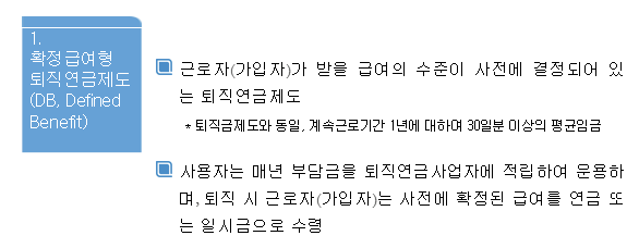 퇴직연금의 수령방법 3가지 중에 첫 번째인 확정급여형(DB형)은 사용자가 매년 일정 금액을 적립하고 근로자는 퇴직 시 사전에 정해진 금액, 즉 근로 기간 1년당 평균임금의 30일분 이상을 연금으로 받습니다.