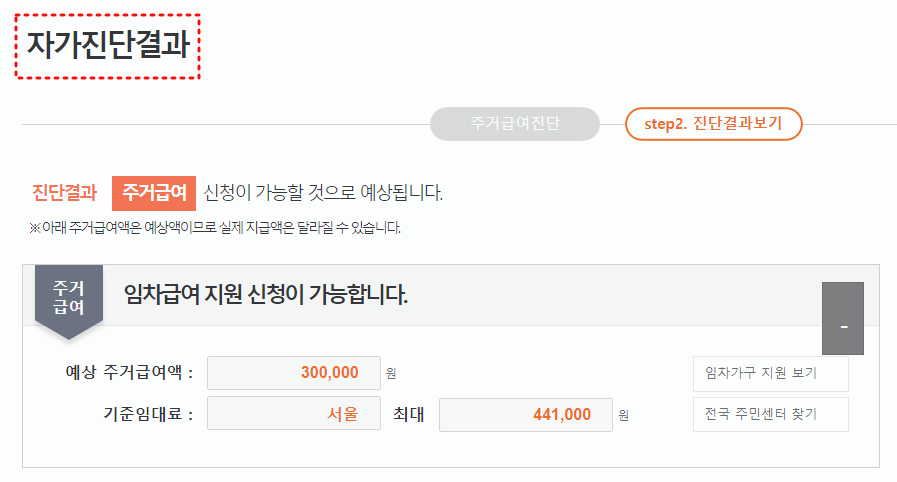 쉬운 방법으로 마이홈 사이트에서 제공하는 주거급여 자가진단을 통해서, 주거형태와 가구의 소득인정액, 청년 주거급여 분리지급 여부를 입력하면 간단하게 지원금액을 계산할 수 있습니다.